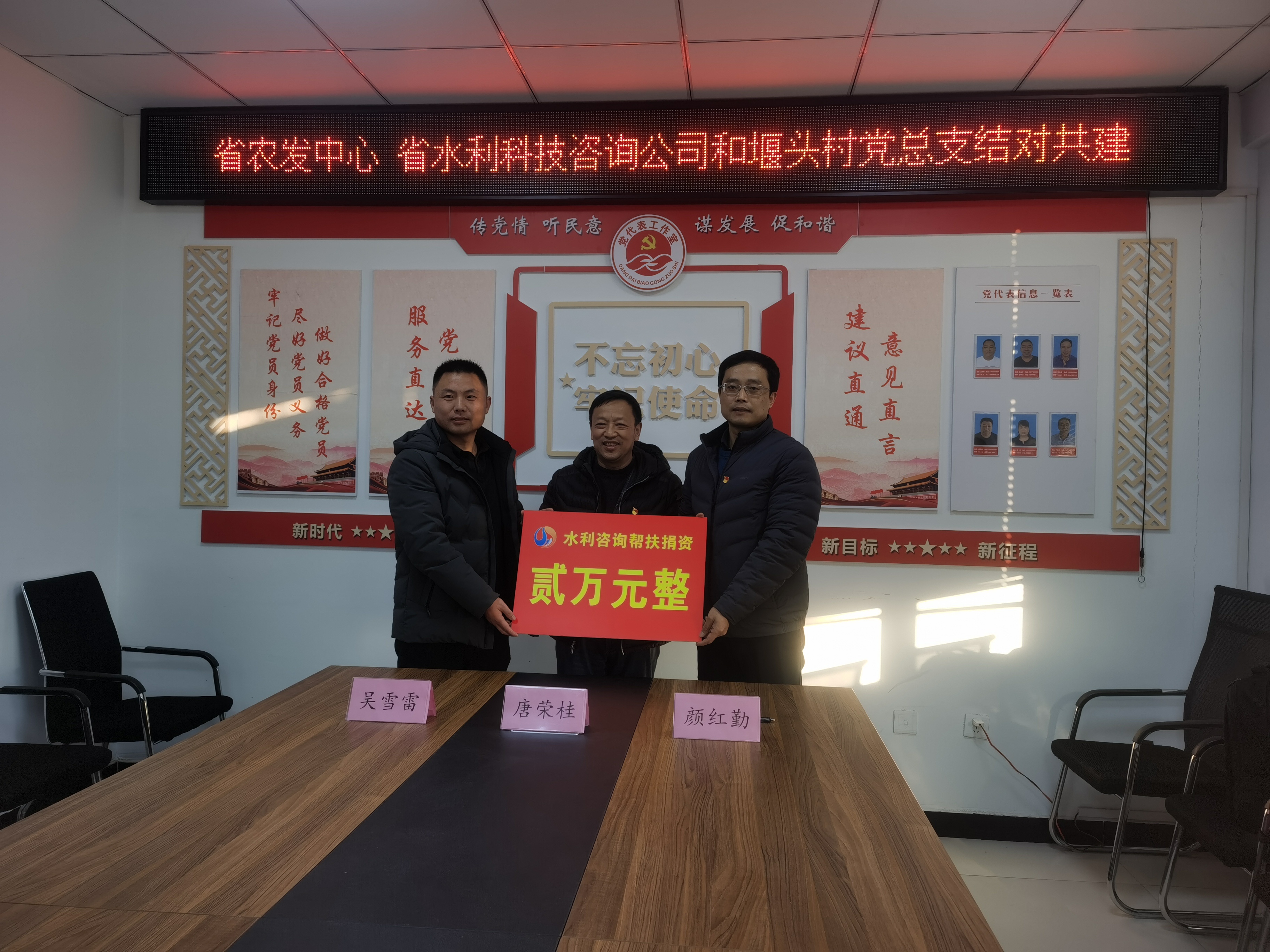 1月13日,公司黨支部書記、董事長兼總經(jīng)理顏紅勤與省農(nóng)村水利科技發(fā)展中心黨支部書記、主任唐榮桂共同帶領(lǐng)相關(guān)工作人員,前往新沂市草橋鎮(zhèn)堰頭村開展結(jié)對共建活動。 本次活動以加強支部共學(xué)共進(jìn)為主題,共建三方分別介紹了支部情況,并就黨建與業(yè)務(wù)開展情況及下階段工作安排進(jìn)行了交流座談,提出了共建目標(biāo)與具體方案。 顏紅勤在座談會上表示,共建是各方相互學(xué)習(xí)的重要途徑,我們將全力支持此項活動,以黨建促聯(lián)建,以聯(lián)建促發(fā)展。我們將充分發(fā)揮水利咨詢單位的資源優(yōu)勢,配合堰頭村在完善村莊規(guī)劃布局、環(huán)境綜合整治布點等方面進(jìn)行綜合規(guī)劃,用實際行動為堰頭村建設(shè)作貢獻(xiàn)。